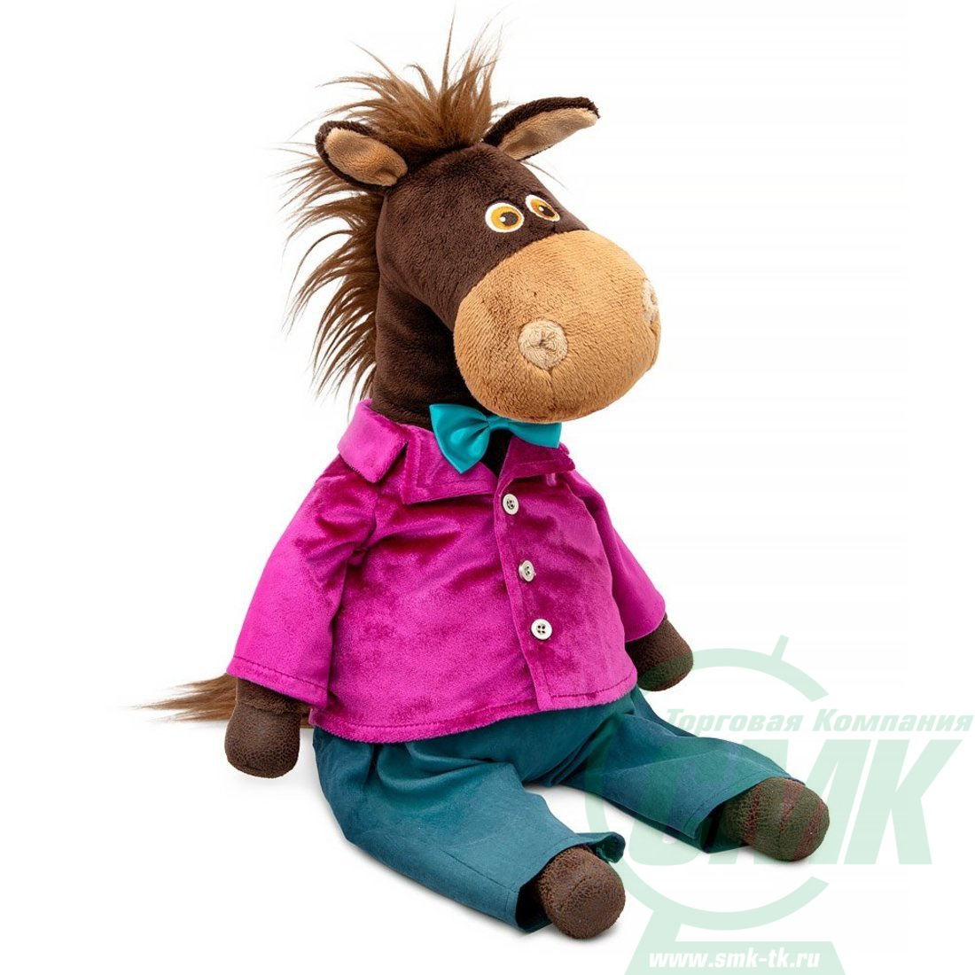 Конь Ричард сшит из софта в песочно-шоколадных оттенках. Грива и хвост из длинного коричневого меха. На Ричарде элегантный лук. Бархатный пиджак яркого и сложного оттенка сиренево-розового цвета на серебристых пуговках, брюки цвета морской волны из плотной ткани, и атласный галстук-бабочка бирюзового цвета.