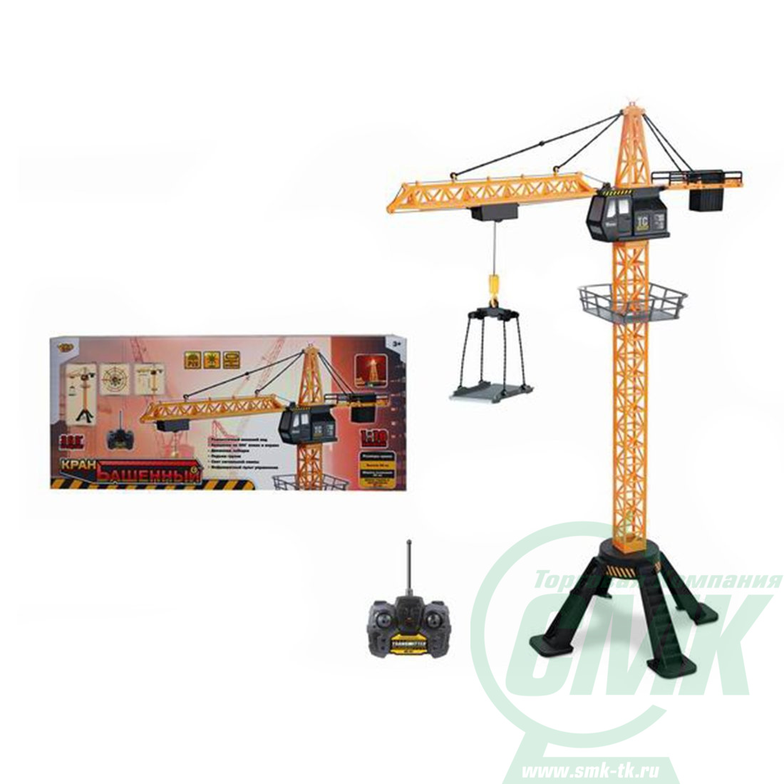 Реалистичный внешний вид. Масштаб 1:18. Высота - 88 см, ширина основания: 34 см. Длина стрелы и противовеса - 59 см. Вращение на 360 градусов. Подъём, спуск груза; движение лебёдки по стреле. Свет сигнальной лампы. Питание: пульт - АА*2шт., кран - АА*4шт. (не входят в комплект). Инструкция по установке батареек и сборке крана включена в дизайн упаковки.