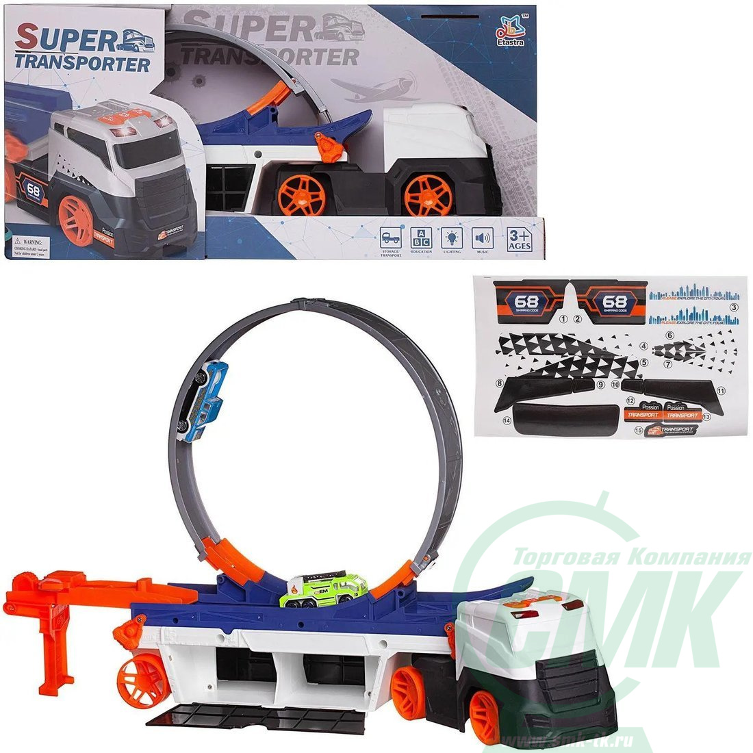 Комплектность: Автовоз-трек-парковка – 1 шт., маленькие машинки – 2 шт., комплект наклеек.