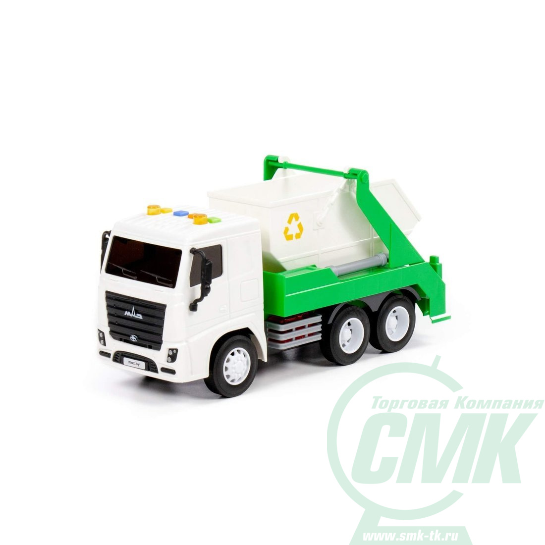 Автомобиль-контейнеровоз изготовлен по лицензии Минского автомобильного завода МАЗ. Данный вид спецтехники предназначен для транспортировки твердых коммунальных отходов. Игрушка многофункциональная: имеет подвижные элементы и оснащена съёмным контейнером. На кабине имеется 4 кнопки управления звуковыми и световыми сигналами. Машинка оснащена инерционным механизмом.