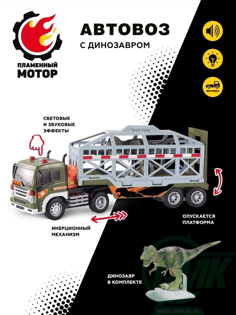 ДЕФЕКТ УПАКОВКИ Автовоз ин. с динозавром в клетке, свет, звук, в комплекте тестовые элементы питания AG13/LR44*3шт. код.870936 арт.870890