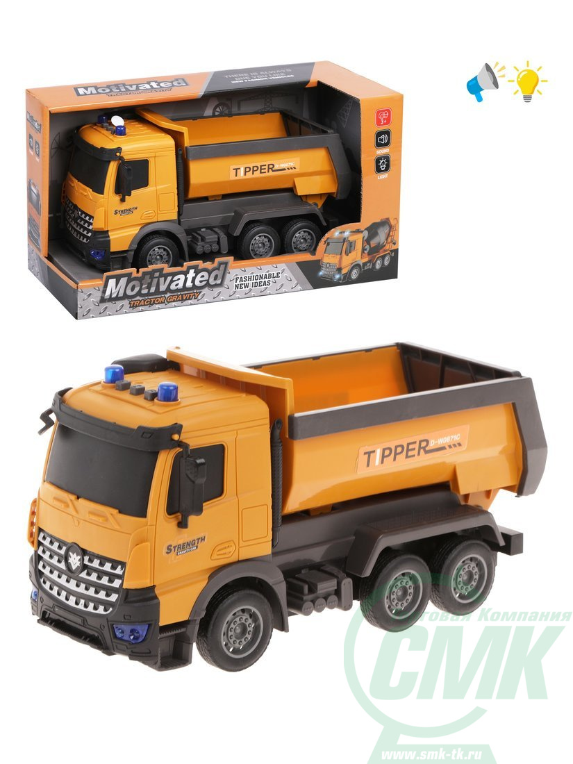 машинка весьма реалистично стилизована под настоящий грузовик. В игрушке предусмотрен фрикционный