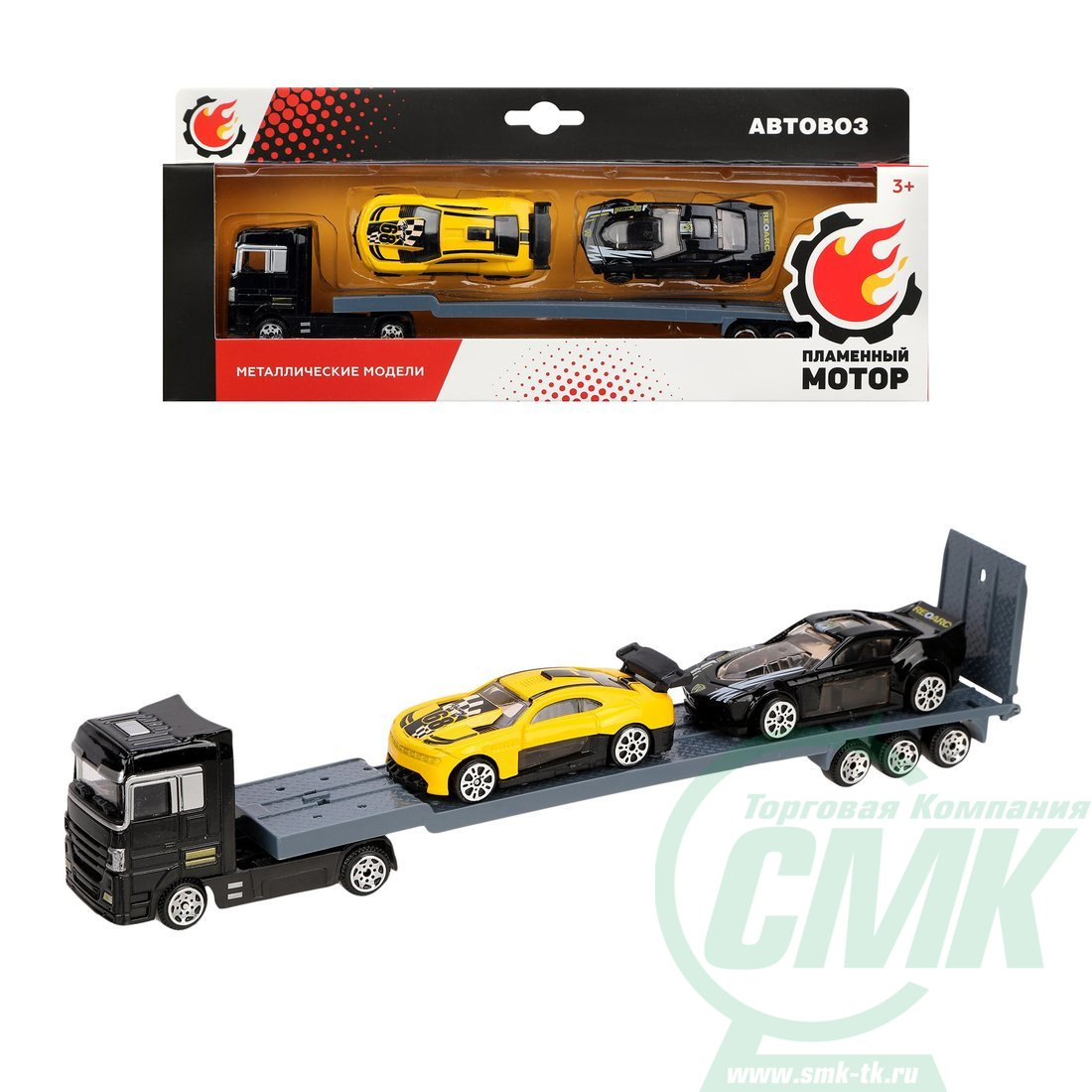 автовоз (24х3х4,5 см) и 2 легковые машинки (7х3х1,5 см) разных цветов. Все