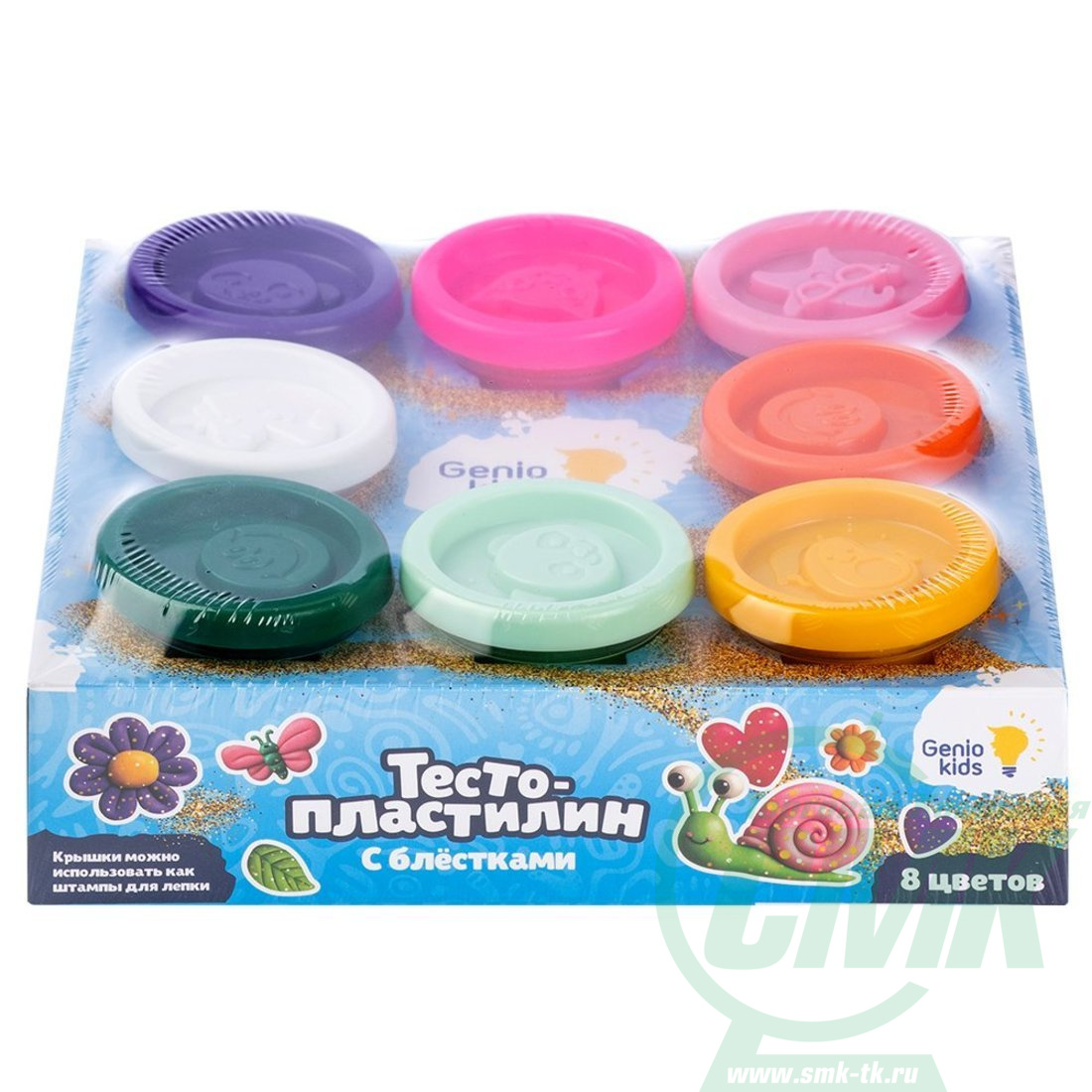 Тесто-пластилин с блестками для еще более яркой игры! 8 цветов теста по 50гр с блестками, каждый цвет в отдельной баночке. Тесто-пластилин Genio Kids - это отличный способ развития творческих способностей малышей. Не липнет к рукам, одежде и повнрхностям, не оставляет следов и не окрашивает руки и поверхности.
