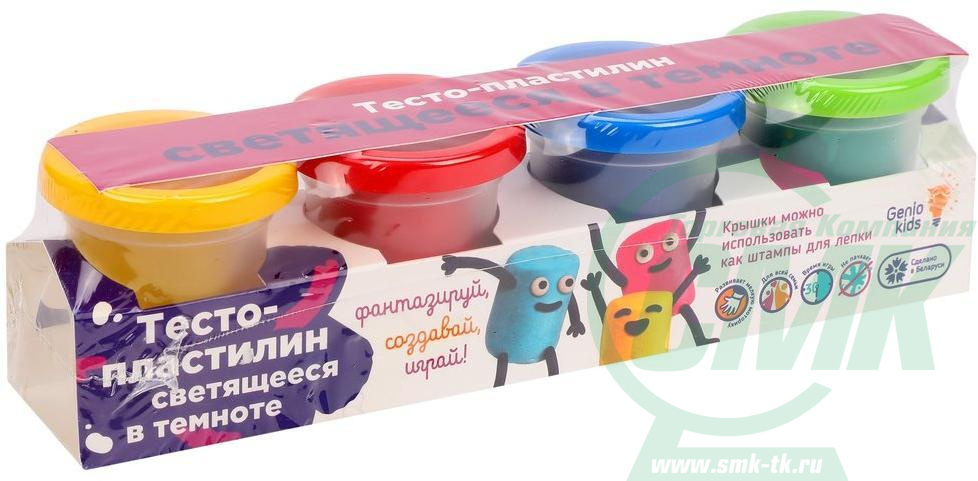 Тесто-пластилин – это натуральный и совершенно безвредный материал, созданный из пшеничной муки. Оно легко смывается и не оставляет после себя грязи. Данное тесто-пластилин светится в темноте. Комплектность набора: 4 баночки с тесто-пластилином по 50 г (синего, зеленого, красного и желтого цветов).