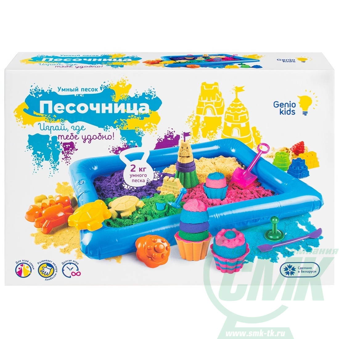 Набор для детского творчества, в который входит 5 цветов песка по 0,4 кг, надувная песочница (41*54 см), 10 формочек, 2 штампика, стек, совок. Песочница определит зону для игры с песком и поможет сохранить порядок в доме. Ребенок лепит, строит, фантазирует и одновременно развивает мелкую моторику, творческие способности и пространственное мышление. Умный песочек хорошо держит форму, не застывает, не липнет, приятный на ощупь, напоминает морской песок.