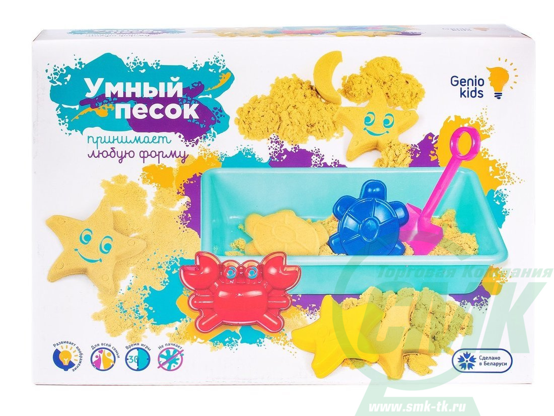 Благодаря входящей в набор пластиковой песочнице, лопатке и формочкам, можно легко играть с умным песком, не выходя из дома на улицу. Что особо понравится малышу, если он лишён возможности погулять из-за плохой погоды.Песочница определит зону для игры с песком и поможет сохранить порядок в доме. Набор Genio Kids развивает творческие способности и воображение. Также подходит для развития мелкой моторики у детей. Не оставляет пятен, не липнет к рукам, не засыхает, очень приятен на ощупь и напоминает морской песок. В состав набора входит 1 кг Умного песка, пластмассовая песочница, лопатка, 3 формочки.